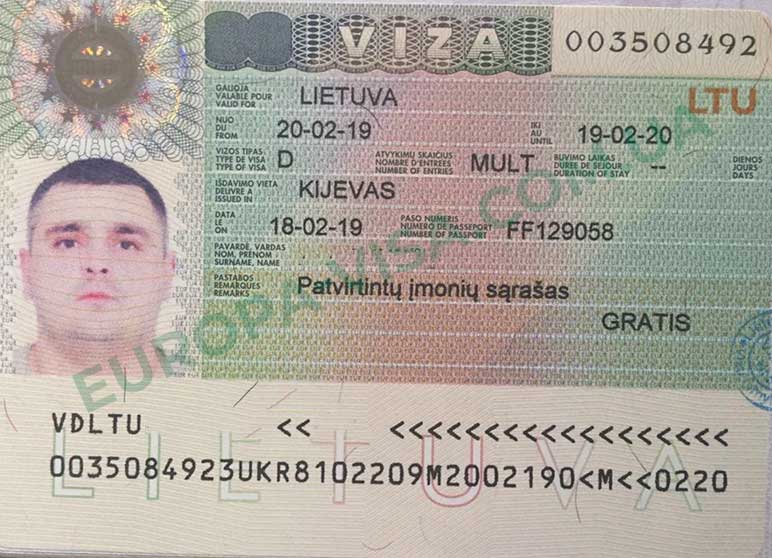 Образец рабочей годовой литовской визы приведен ниже: